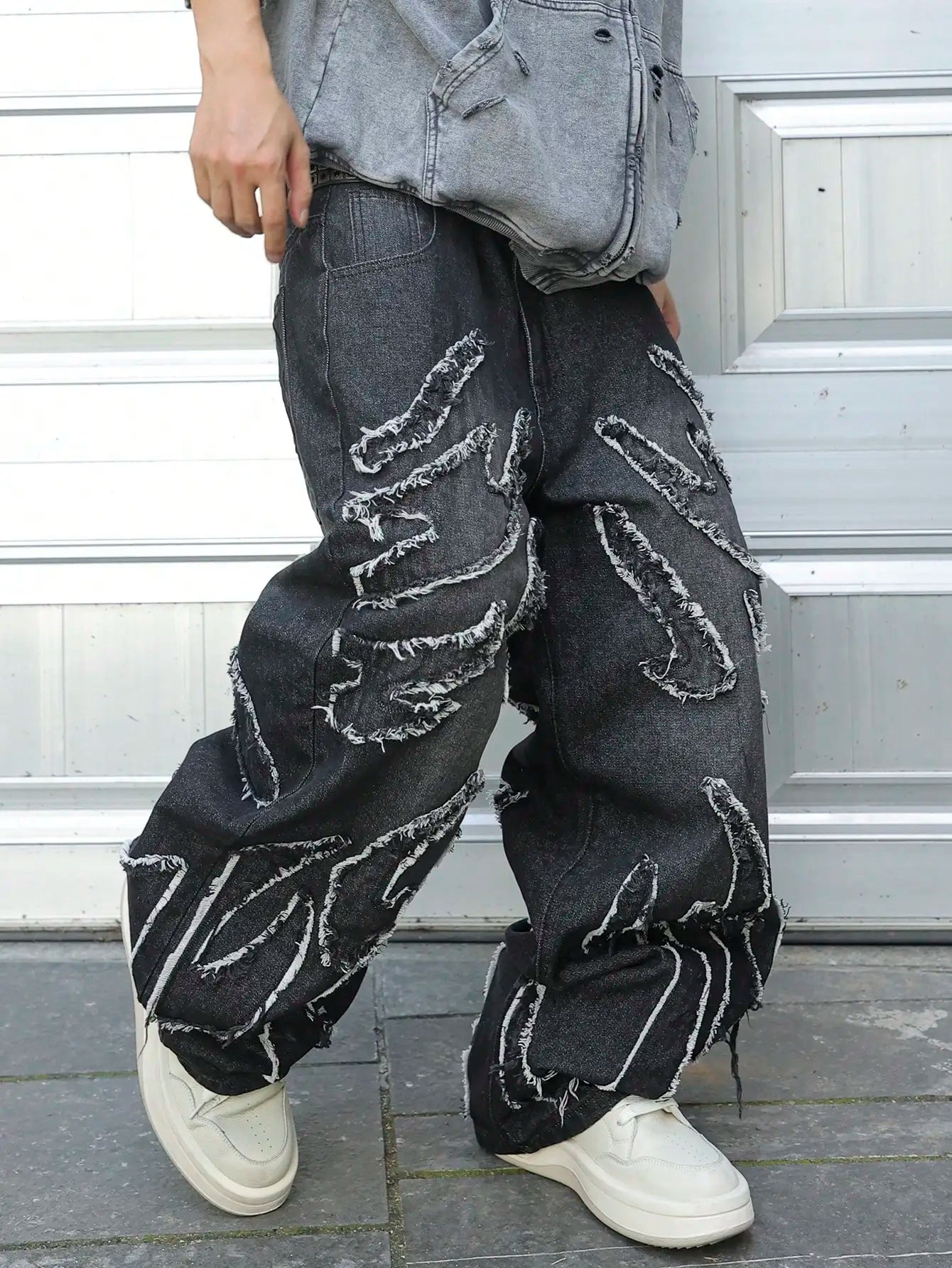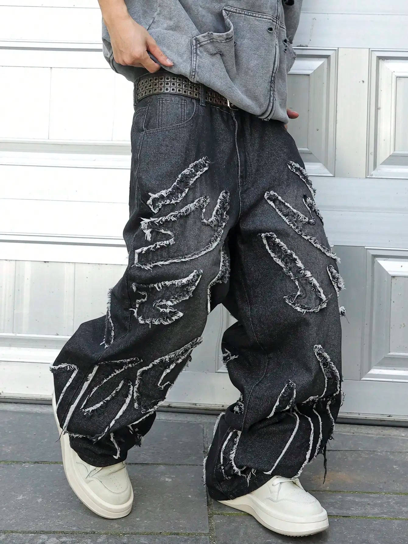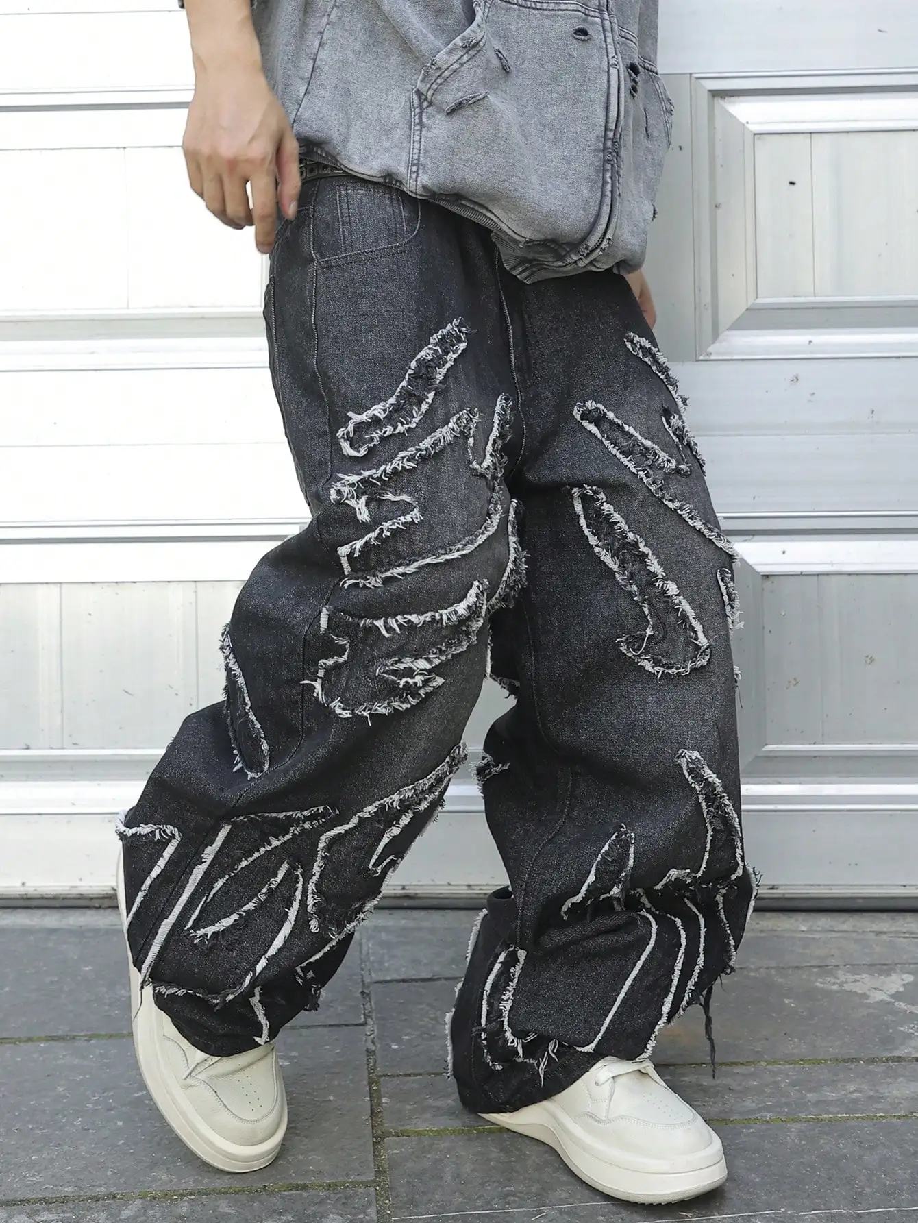 This is a pair of jeans with a vintage style and a frayed edge design. It belongs to the category of trendy streetwear. The loose - fitting wide - leg jeans are suitable for street fashion styling scenarios.