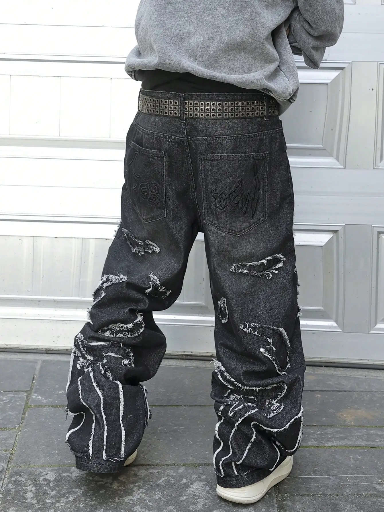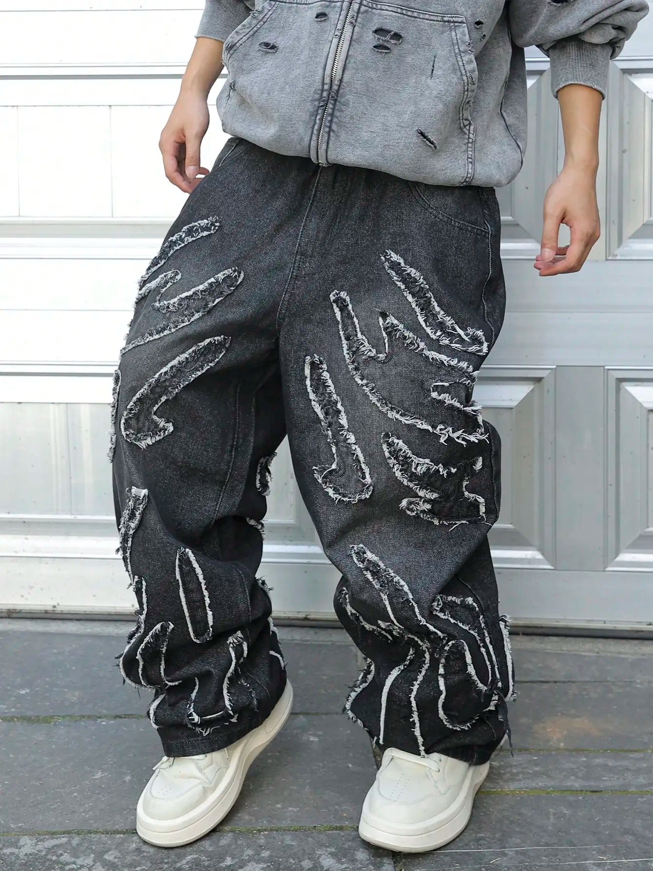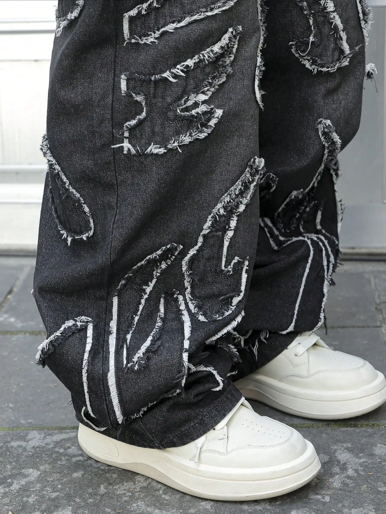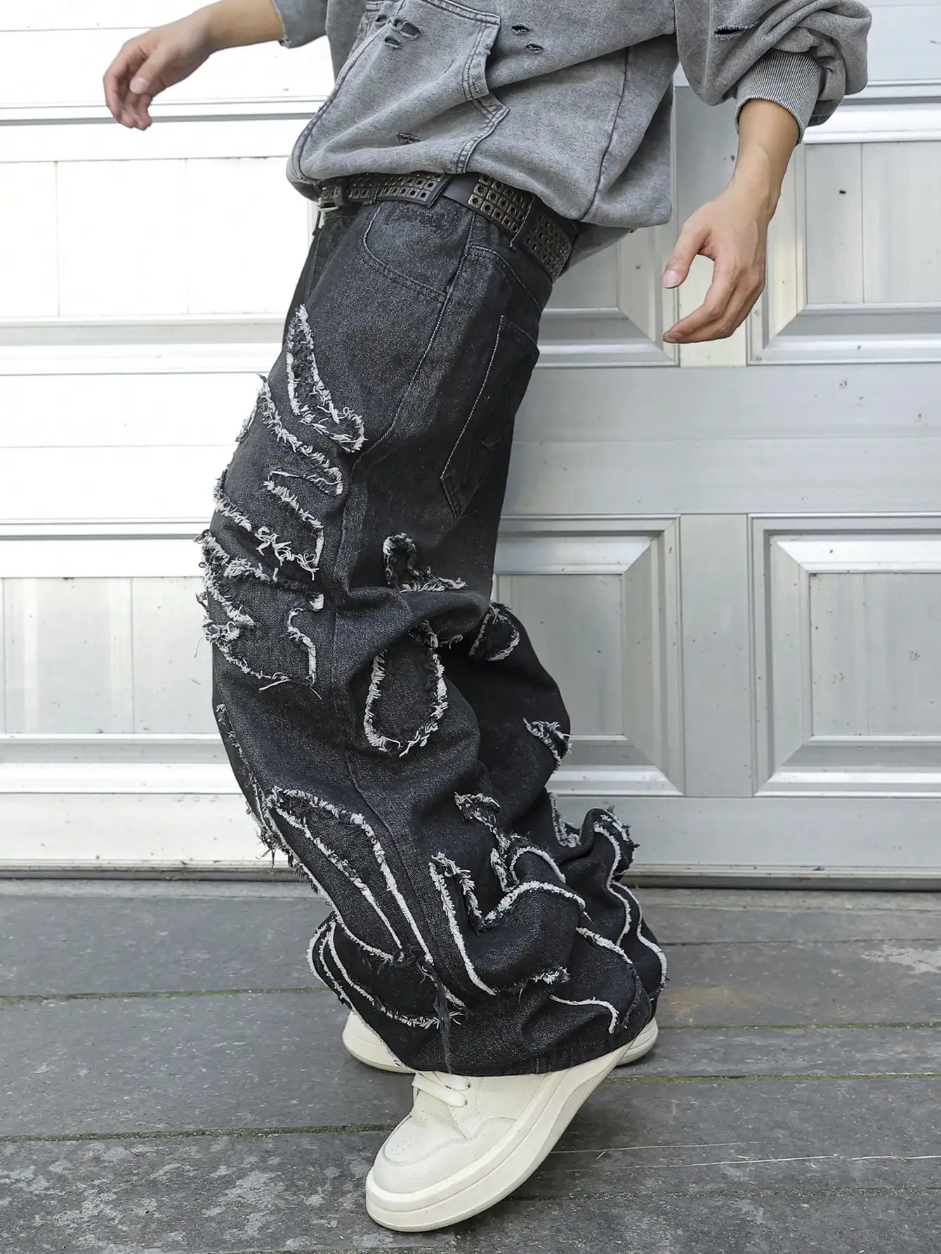 This is a pair of jeans with a vintage style and a frayed edge design. It belongs to the category of trendy streetwear. The loose - fitting wide - leg jeans are suitable for street fashion styling scenarios.