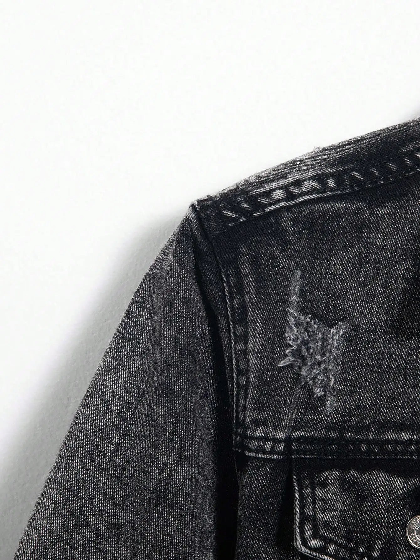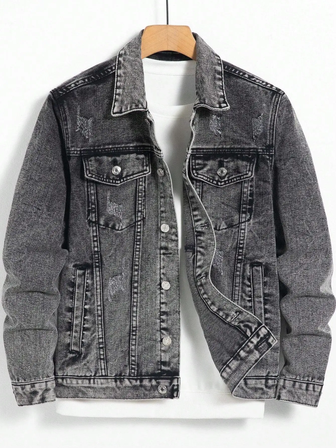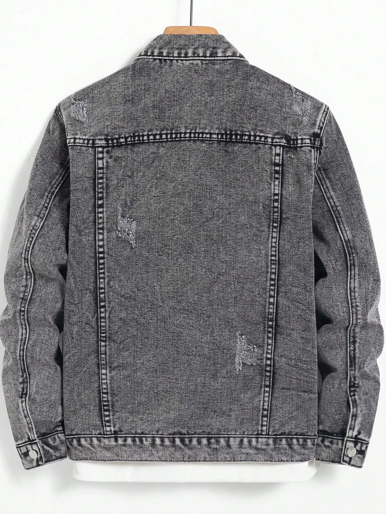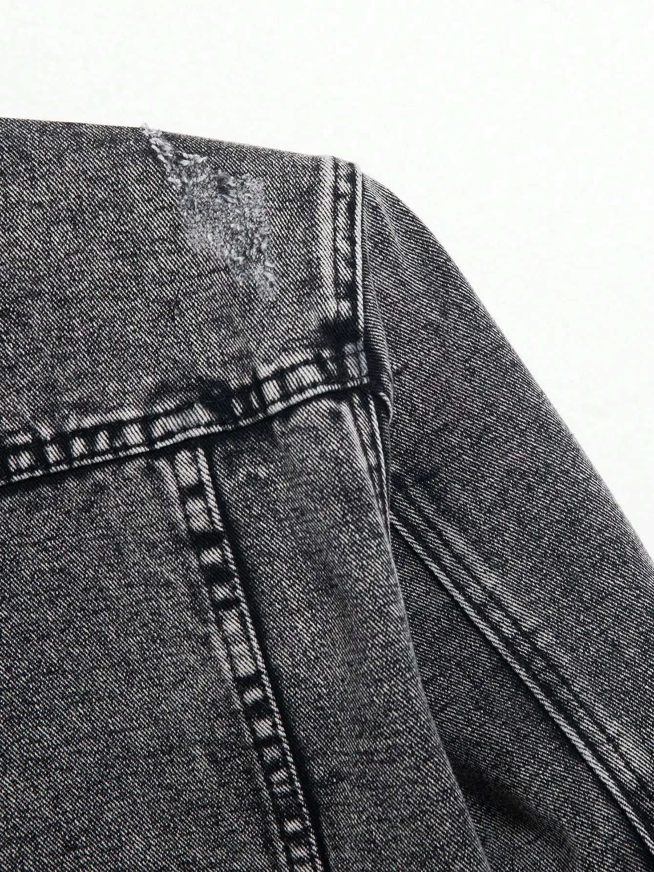 This is a dark gray denim jacket with a classic denim silhouette. It features a lapel collar, symmetrical chest pockets, and diagonal side pockets. The distressed washing process and (hole) design add a vintage and trendy vibe, while the metal buttons serve both practical and decorative purposes. This jacket is versatile enough to match various styles, making it a casual and timeless piece for any wardrobe.