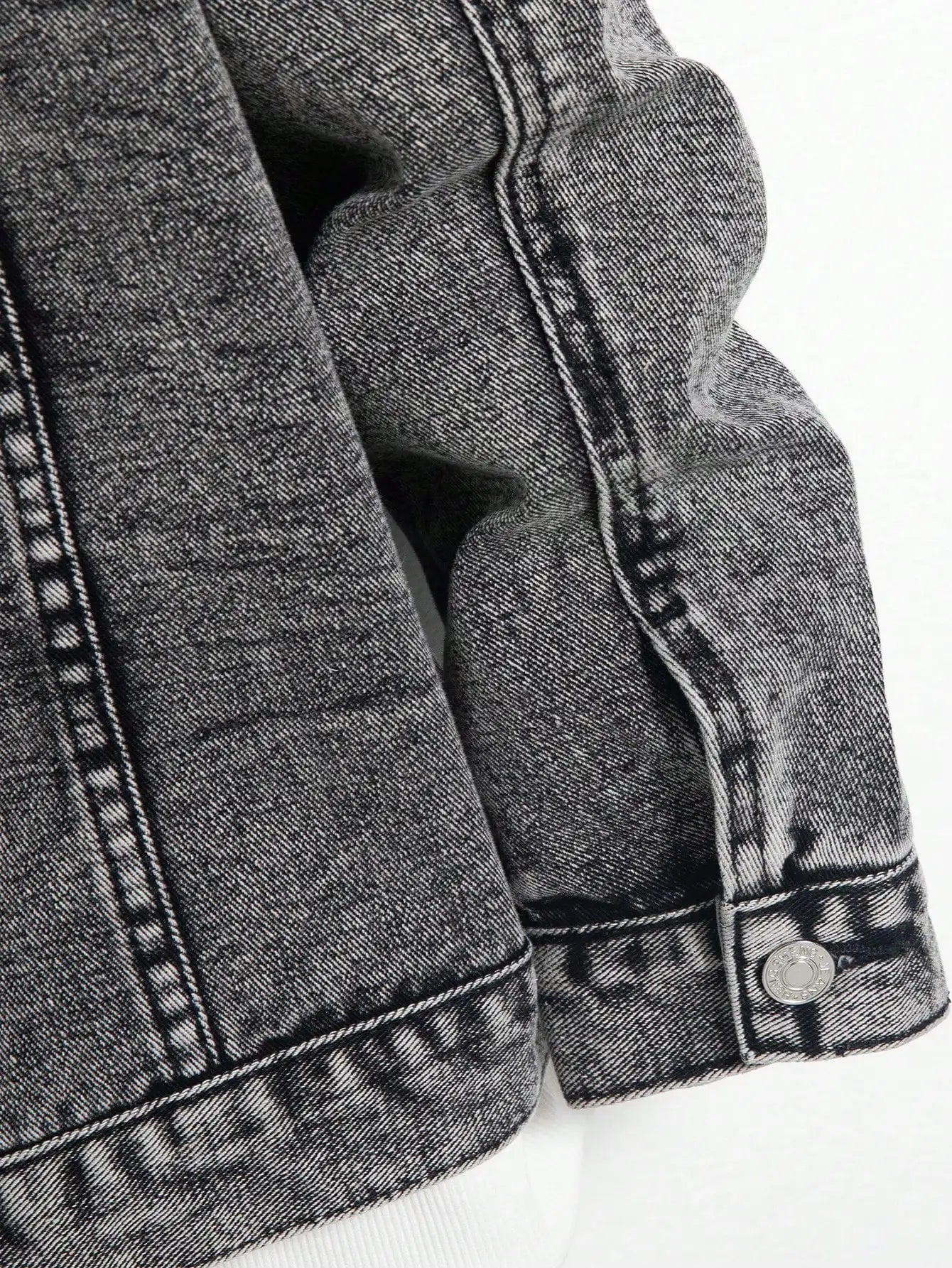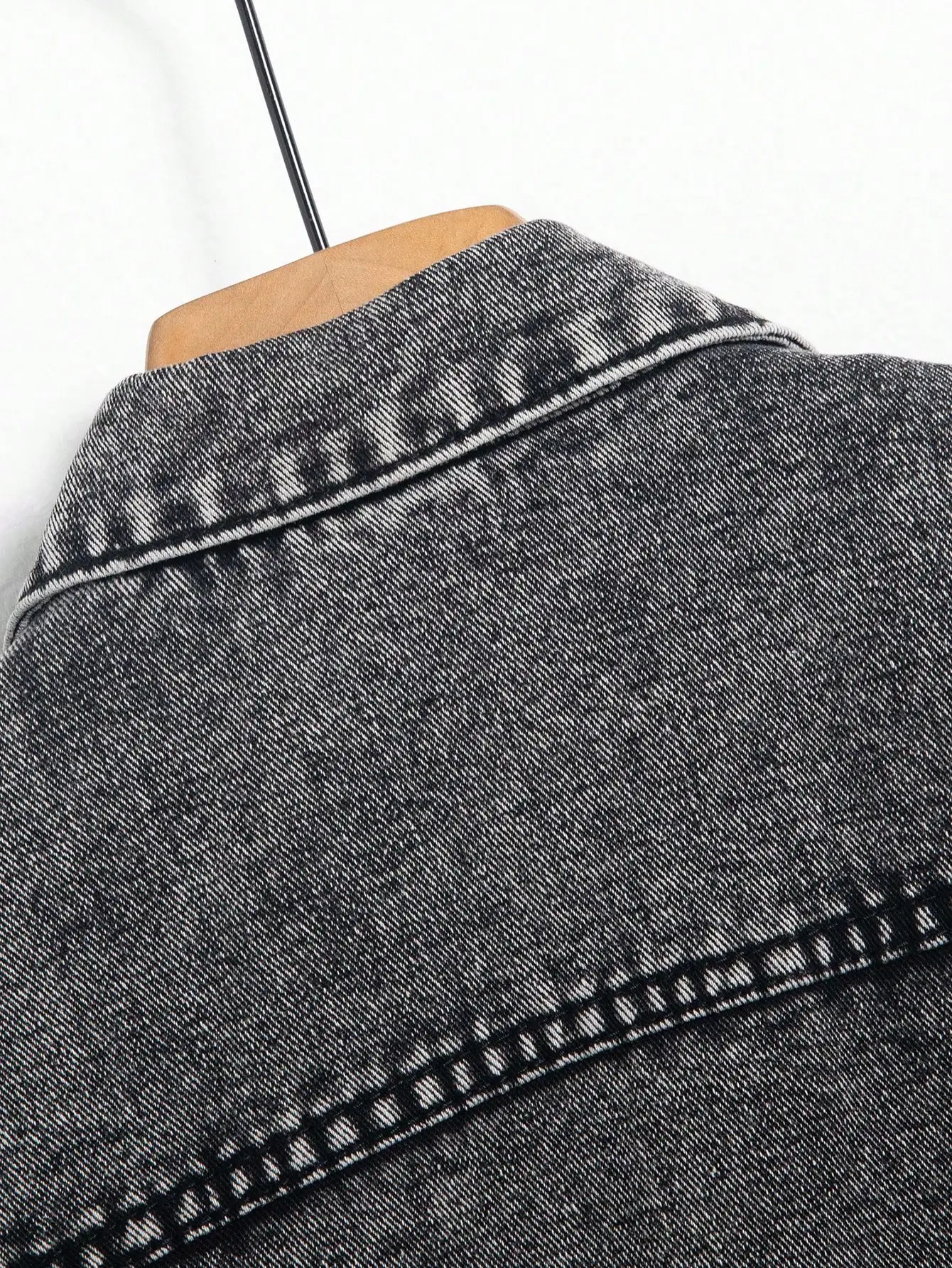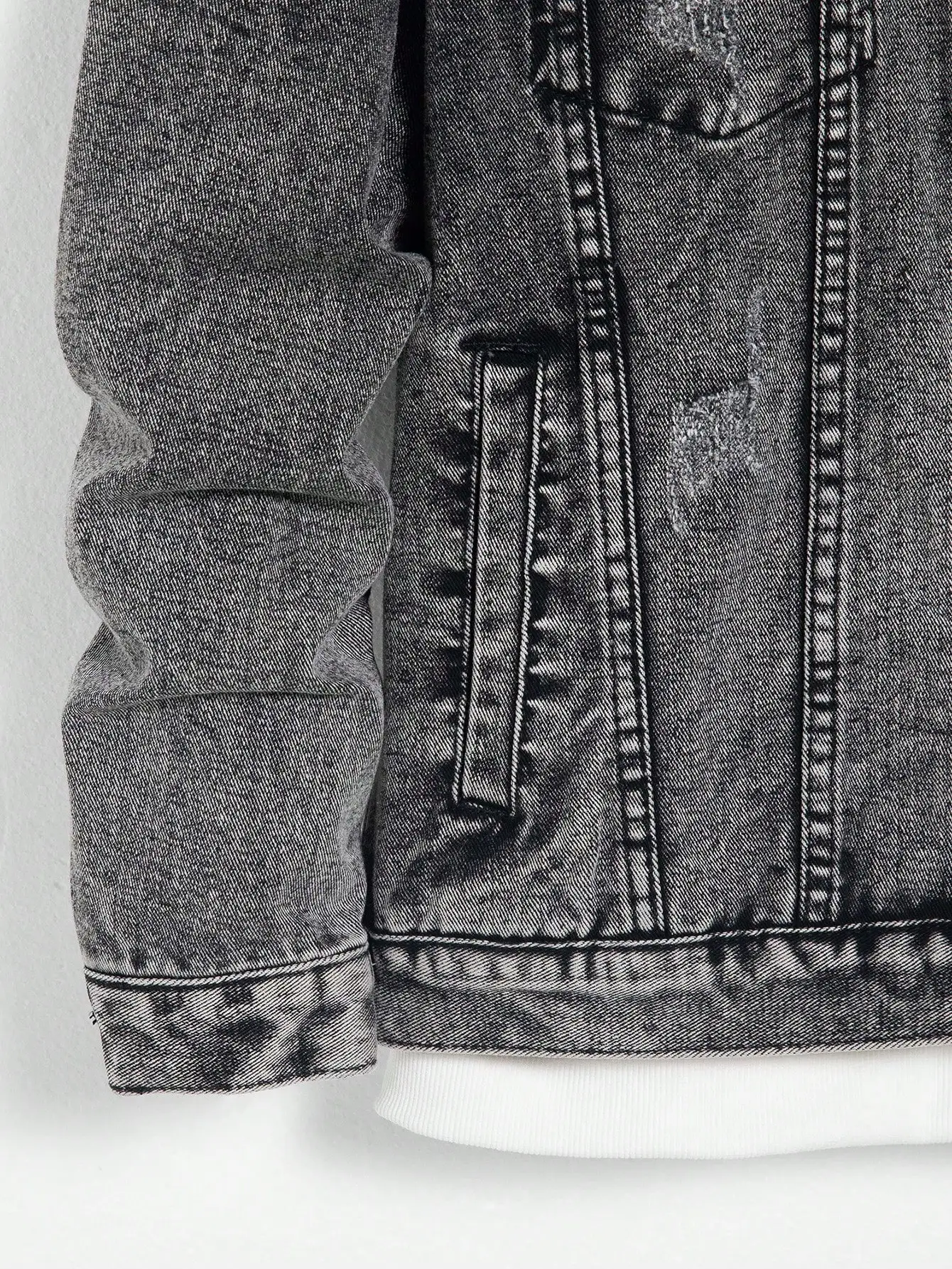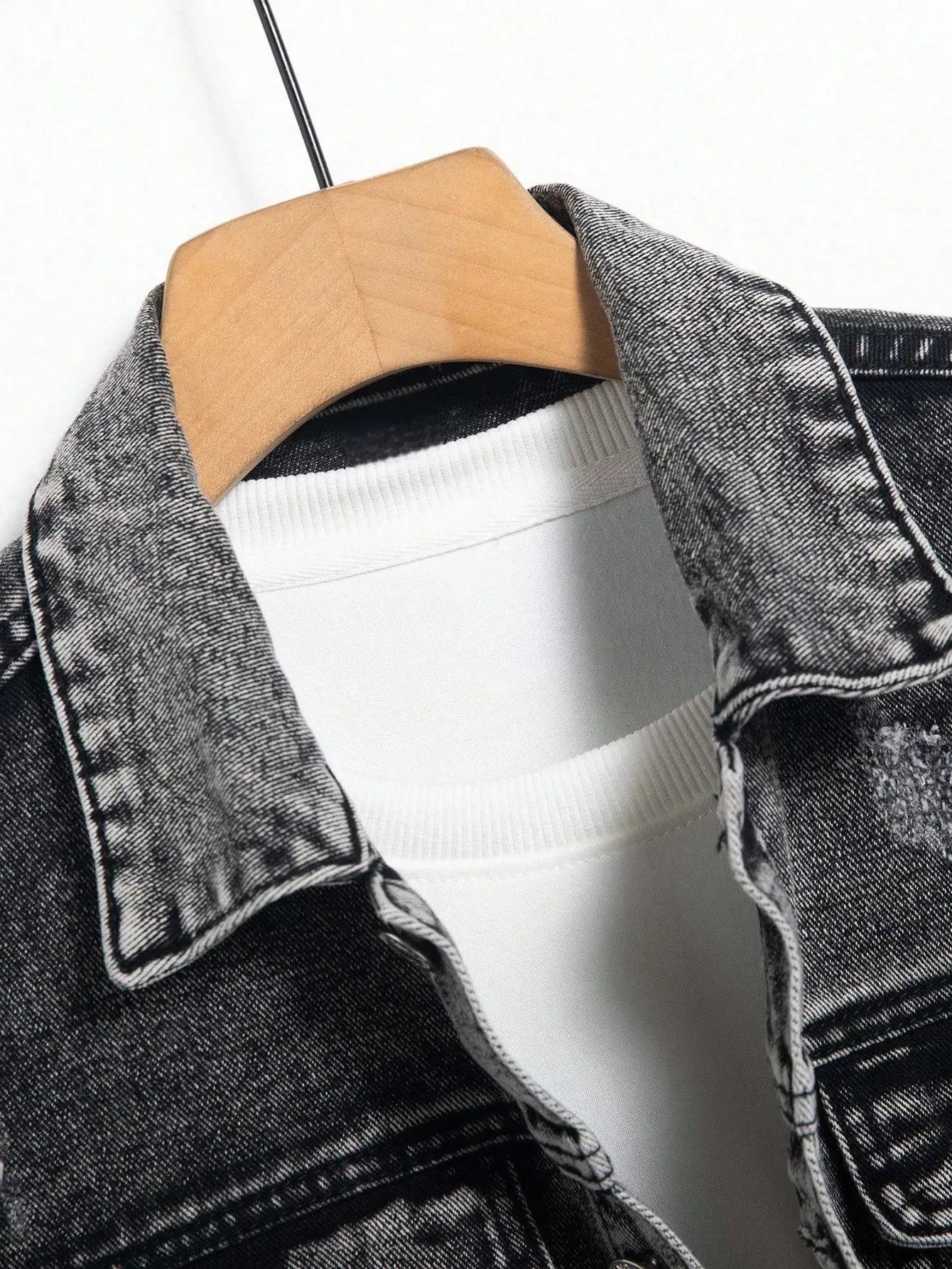 This is a dark gray denim jacket with a classic denim silhouette. It features a lapel collar, symmetrical chest pockets, and diagonal side pockets. The distressed washing process and (hole) design add a vintage and trendy vibe, while the metal buttons serve both practical and decorative purposes. This jacket is versatile enough to match various styles, making it a casual and timeless piece for any wardrobe.